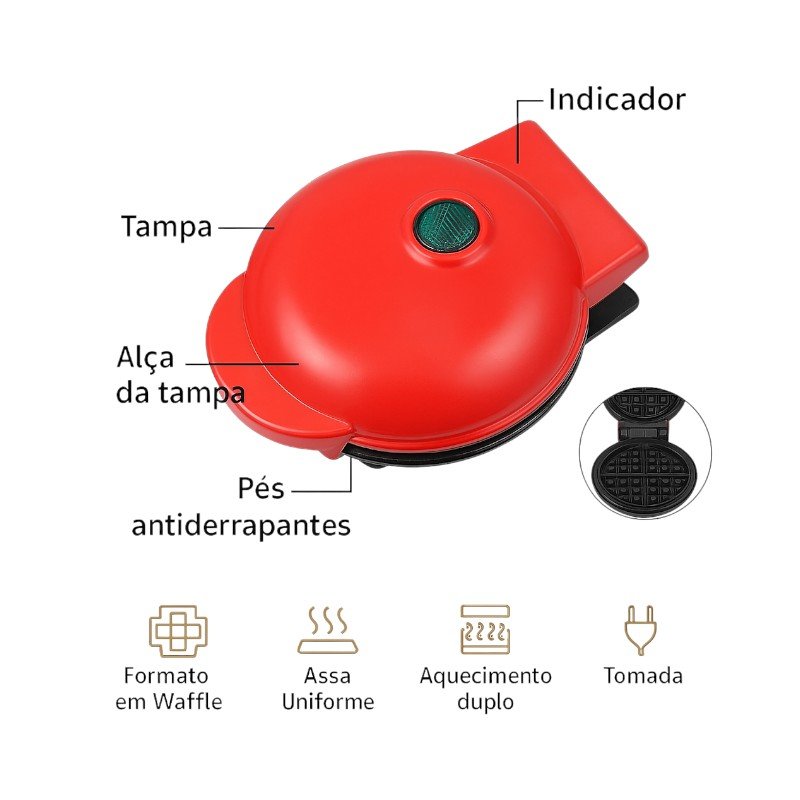 1x Mini Máquina de Waffle Elétrica (formato redondo ou coração – envio aleatório)