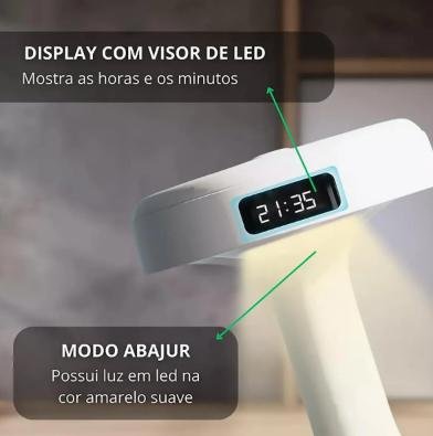 Modo de uso: Toque ou botão sensível para alternar luz, relógio e funções de neblina